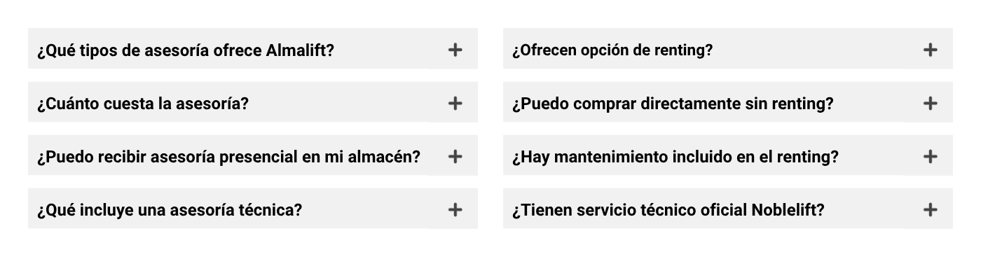 En Almalift creemos que la mejor venta viene acompaña de un servicio como nuestra asesoría, donde a través de conocerte mejor, a tí y a tu empresa, podremos recomendarte la máquina ideal para tus necesidades.